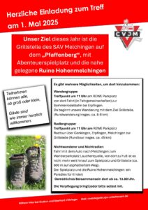der diesjährige Maitreff für die ganze CVJM Familie ist der Abenteuerspielplatz „Pfaffenberg“ mit Grillstelle des SAV Melchingen oberhalb Melchingen ganz in der Nähe der Ruine Hohenmelchingen