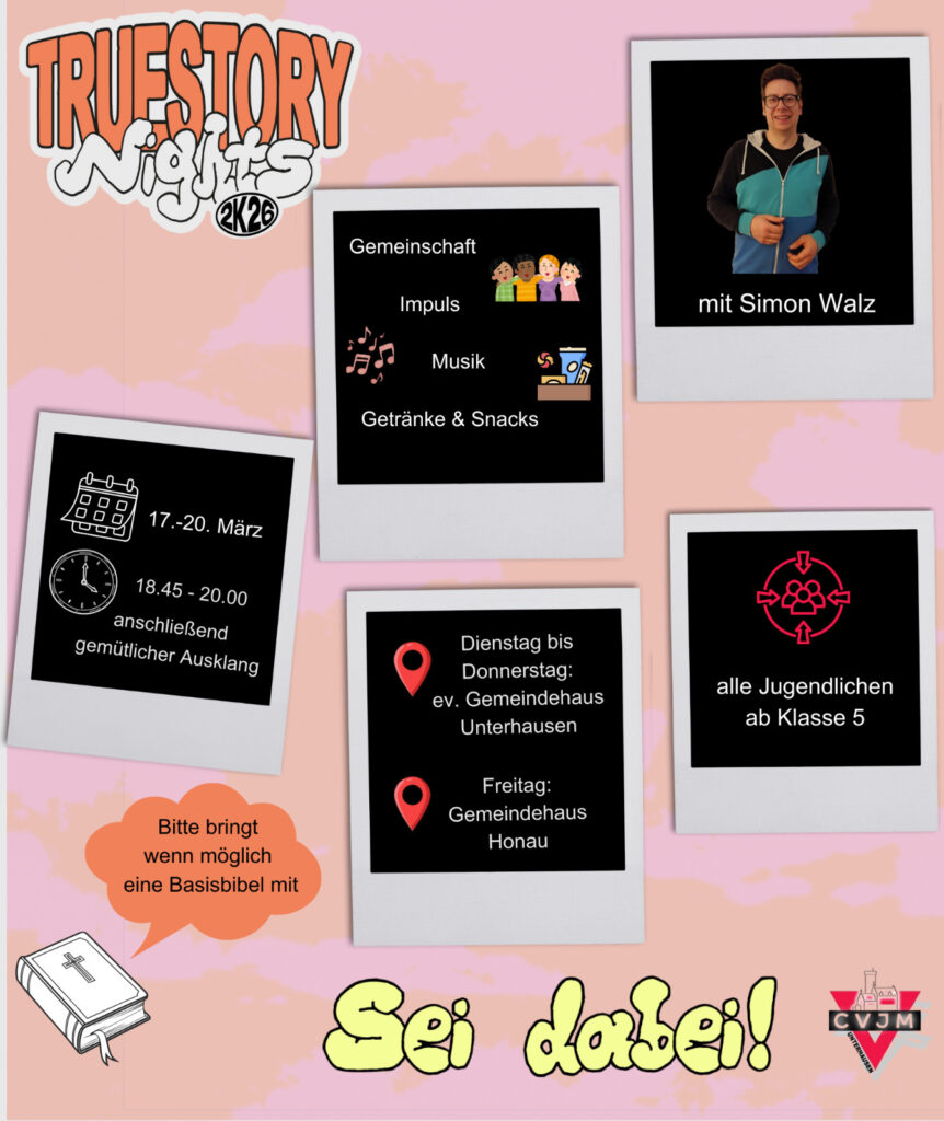 Vom 17.03. bis 20.03. findet die Truestory für Jugendliche ab der 5. Klasse ab. Wir vom CVJM laden von Dienstag bis Donnerstag ins ev. Gemeindehaus in Unterhausen und am Freitag nach Honau ins ev. Gemeindehaus ein. Start ist jeweils um 18:45 Uhr. Offizielles Ende ist 20 Uhr, danach gibt es noch eine Ausklangphase für alle, die noch bleiben wollen, mit Essen und Getränken, Tischkickerspielen und kleinen Aktionen.